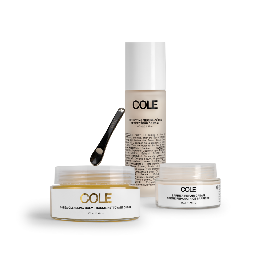 Includes 3 products: Omega Cleansing Balm (100mL), Perfecting Serum (60mL), Barrier Repair Cream (50mL), plus a COLE Metal Spoon.